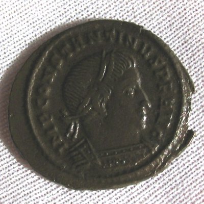 【コインの表】IMP CONSTANTINVS PF AVG -胴よろいを身に着け月桂樹の冠を被ったコンスタンティヌス大帝の肖像。