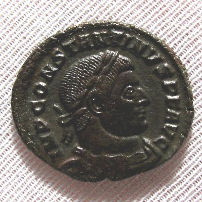 【コインの表】IMP CONSTANTINVS P F AVG - 胴鎧を身に着けマントを羽織り月桂樹の冠を戴いたコンスタンティヌス大帝の肖像。